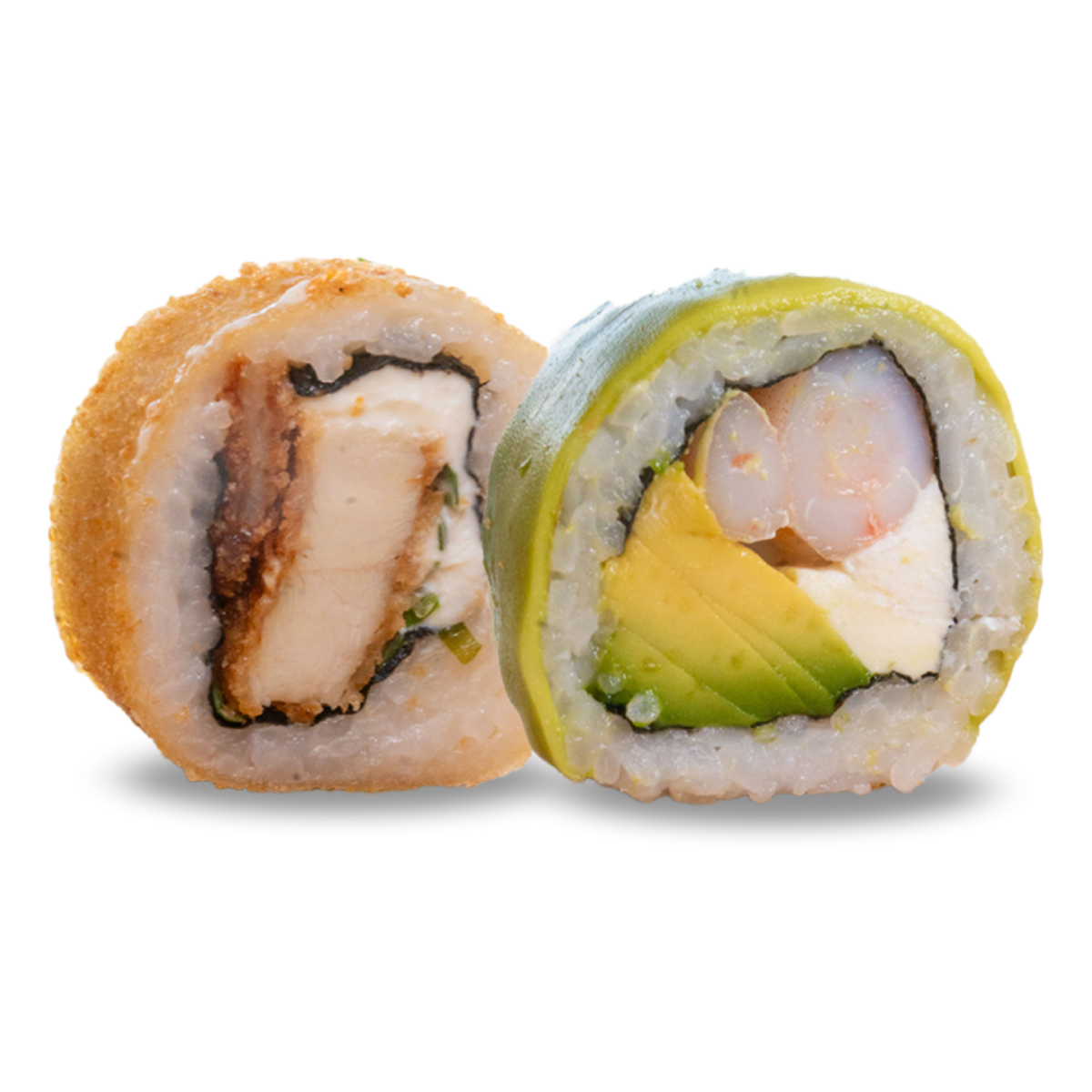 10 rollos rellenos de camarón, queso crema y palta, envuelto en palta.