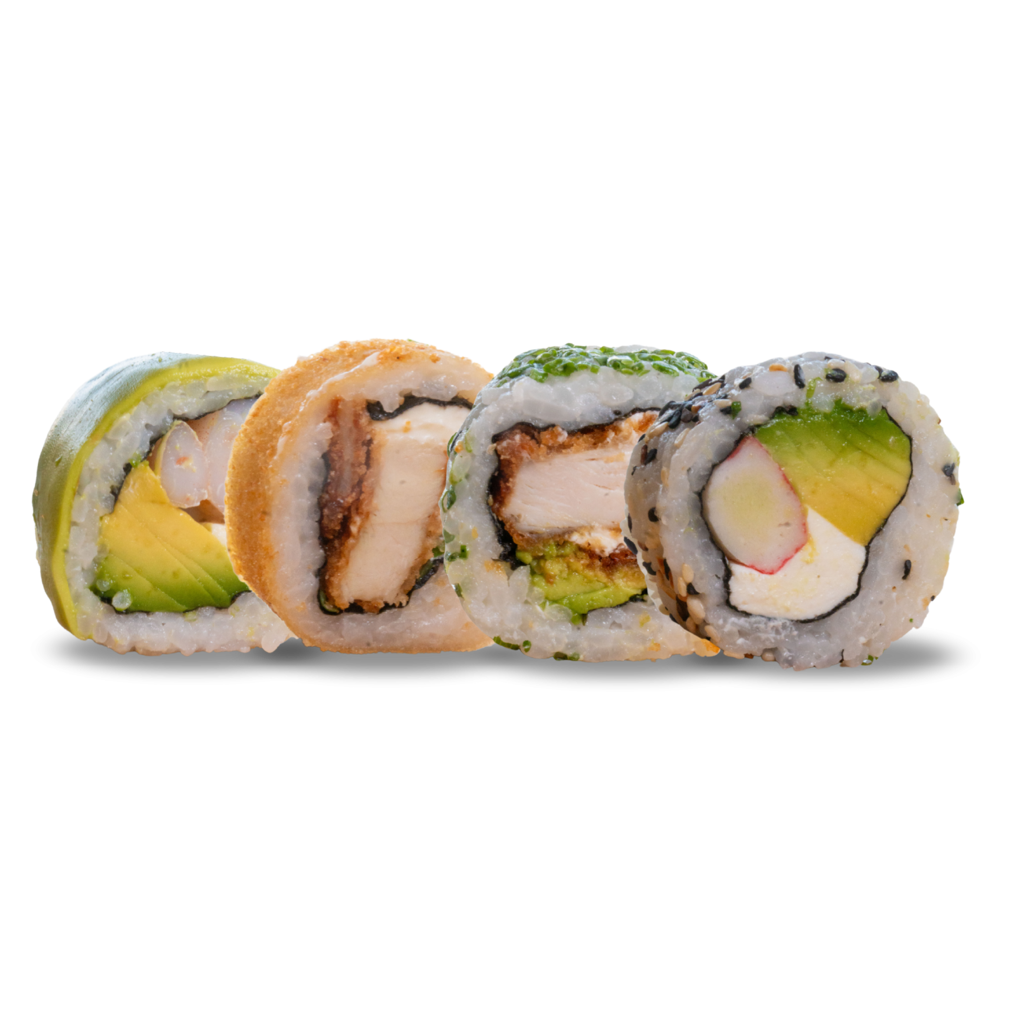 10 rollos rellenos de camarón, queso crema, palta, envuelto en palta.