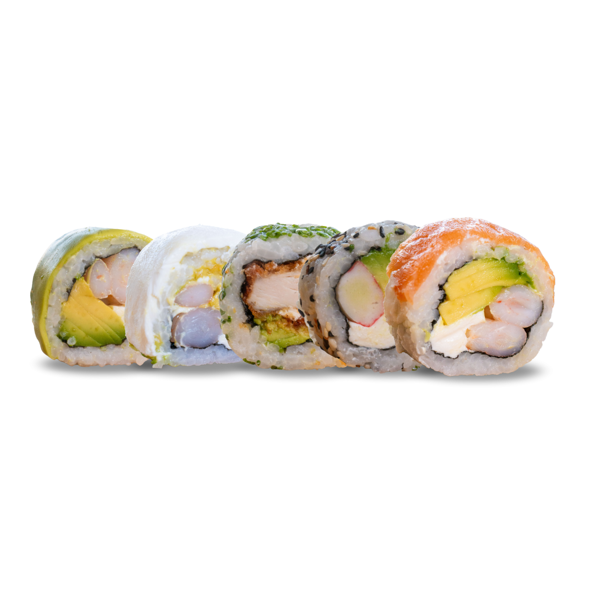 10 rollos rellenos de pollo, queso crema, palta, envuelto en ciboullete. 10 rollos rellenos de kanikama, queso crema, palta, envuelto en sésamo. 10 rollos rellenos de camarón, queso crema, palta, envueltos en palta. 10 rollos rellenos de camarón, queso crema, palta, envueltos en salmón. 10 rollos rellenos de camarón, queso crema, palta, envueltos en queso crema.