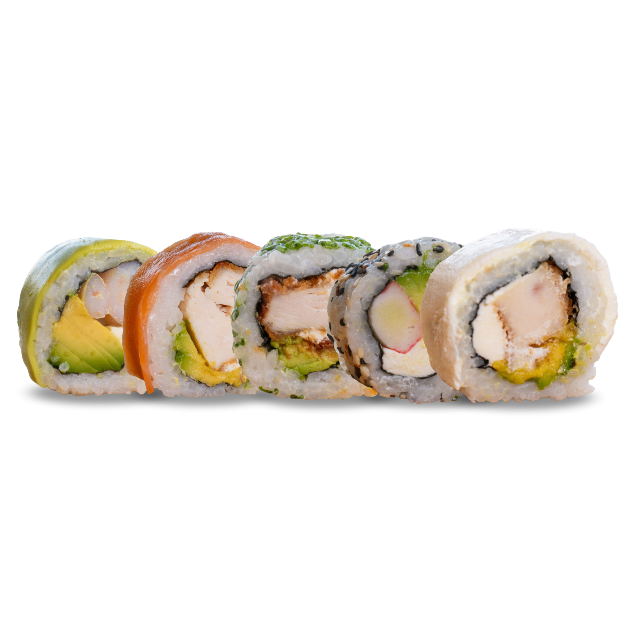 10 rollos rellenos de kanikama, queso crema, palta, envuelto en sésamo.